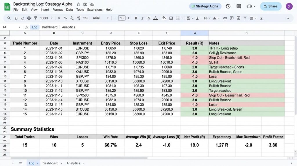 The Result (R) column is particularly important. Express results in R-multiples — where 1R equals the amount you risked on the trade. A trade that hit a 2× target returns +2R. A trade stopped out returns -1R. This standardizes results regardless of position size and makes mathematical analysis easier.