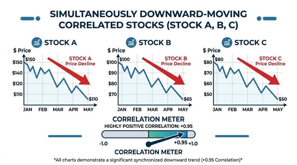 This happens because those stocks — despite being from different companies — are highly correlated. They move together. And when the broader market sells off, correlation between most stocks spikes dramatically — often approaching +1.